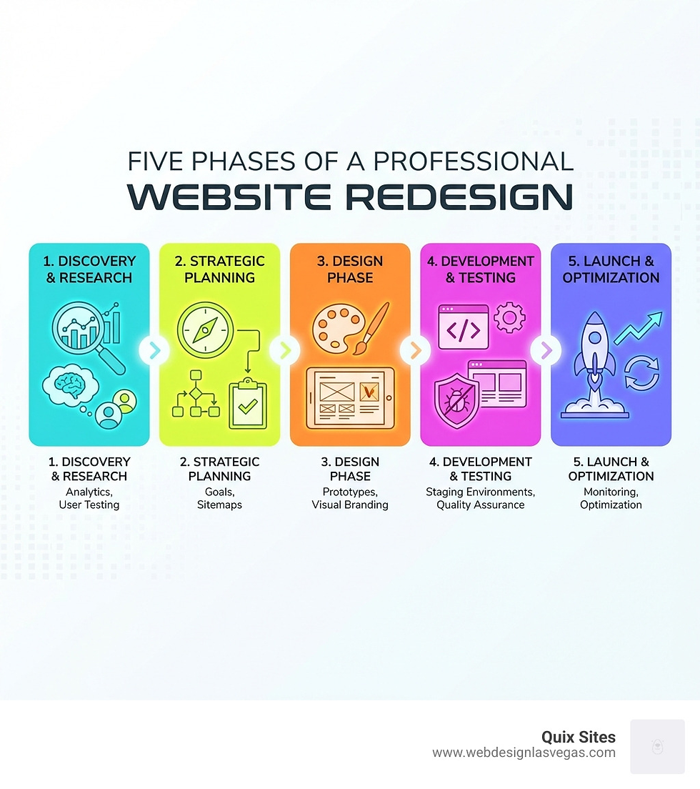 At Quix Sites, we break down the professional website redesign into five distinct phases to ensure nothing falls through the cracks.